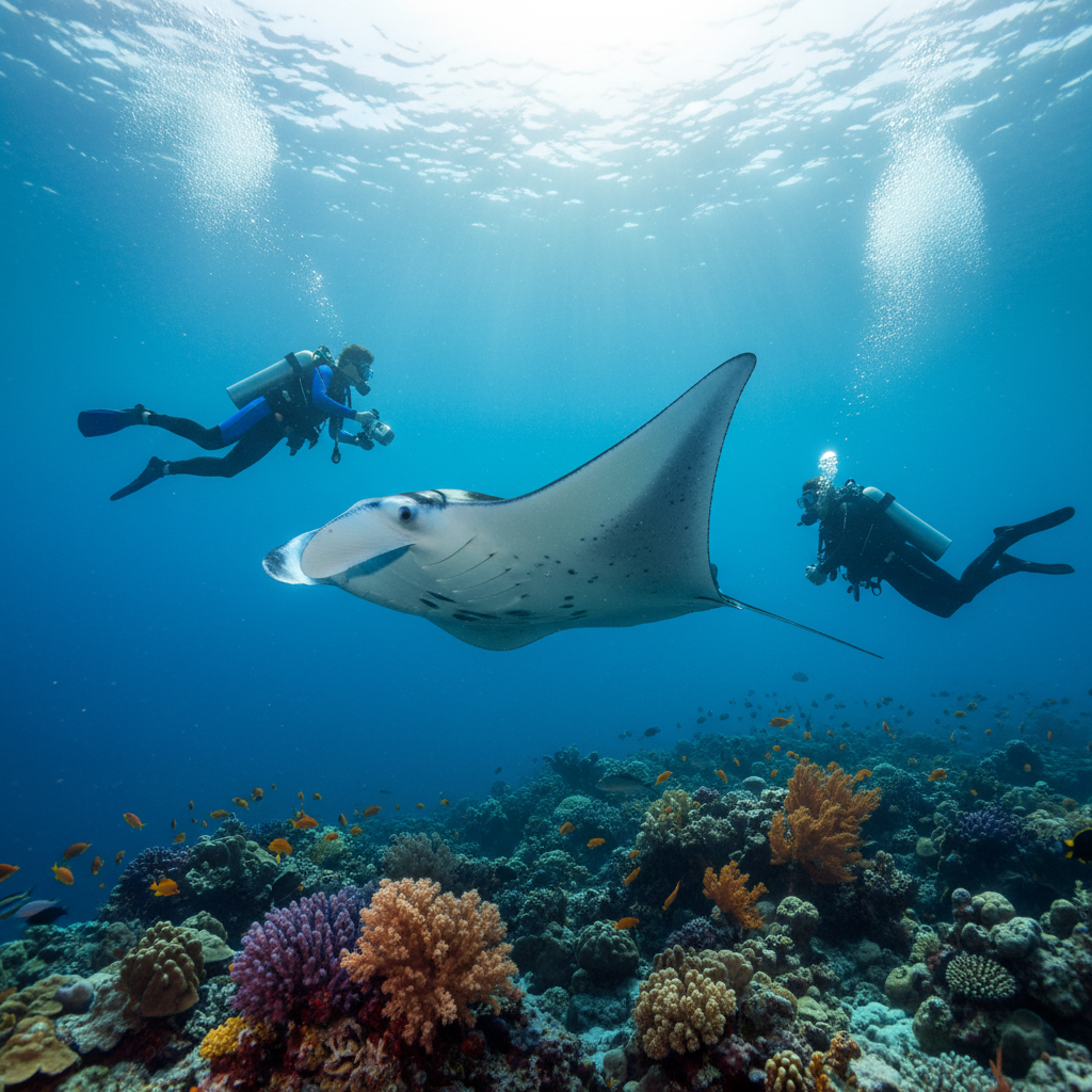 A UNESCO-protected bay where plankton-rich currents trigger cyclone feeding aggregations of 200+ manta rays. Strictly a snorkelling experience, accessible with licensed guides only. This is a strictly seasonal phenomenon, running from June to November — and during peak season, whale sharks join the mantas in one of the greatest marine spectacles on Earth.